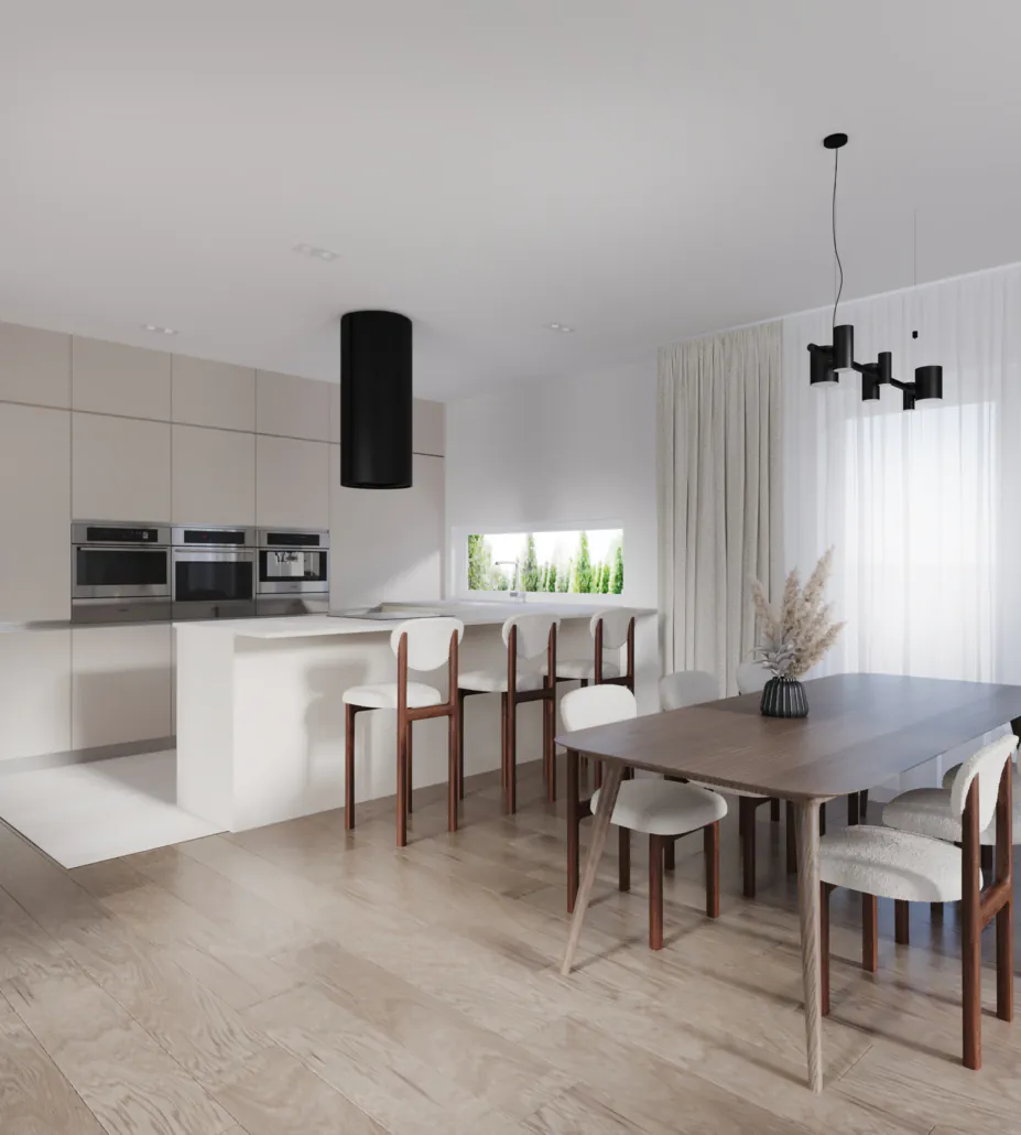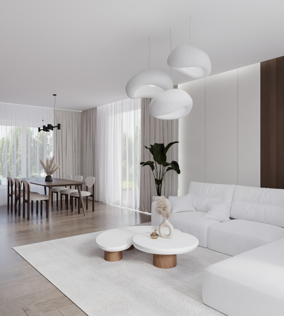 Już od progu dom wita jasnym, otwartym wnętrzem, w którym naturalne światło podkreśla przytulny charakter przestrzeni. Serce domu stanowi duży, przestronny salon – idealny zarówno do rodzinnego wypoczynku, jak i spotkań z bliskimi. Płynne połączenie strefy dziennej z częścią prywatną zapewnia swobodę i poczucie równowagi między życiem towarzyskim a chwilami relaksu.
