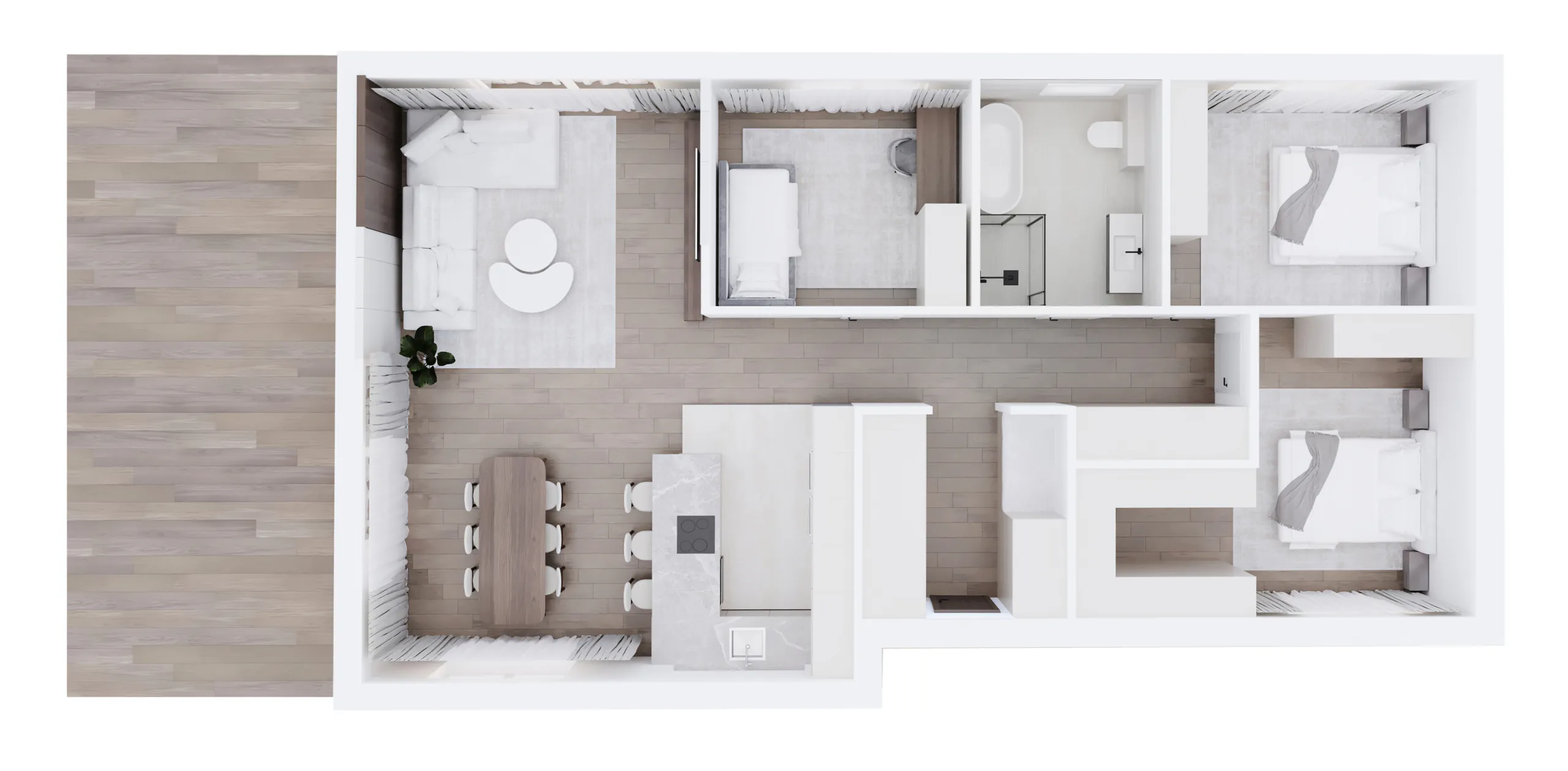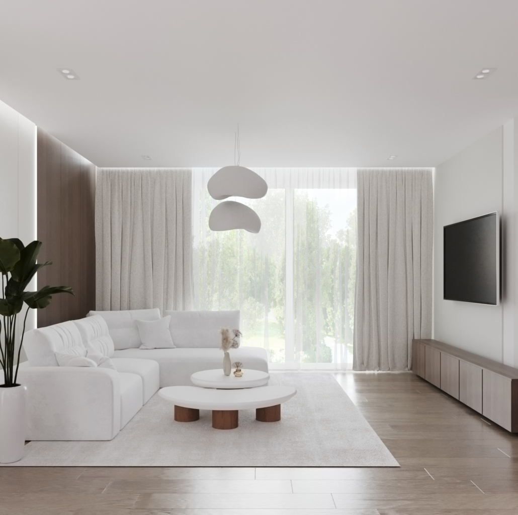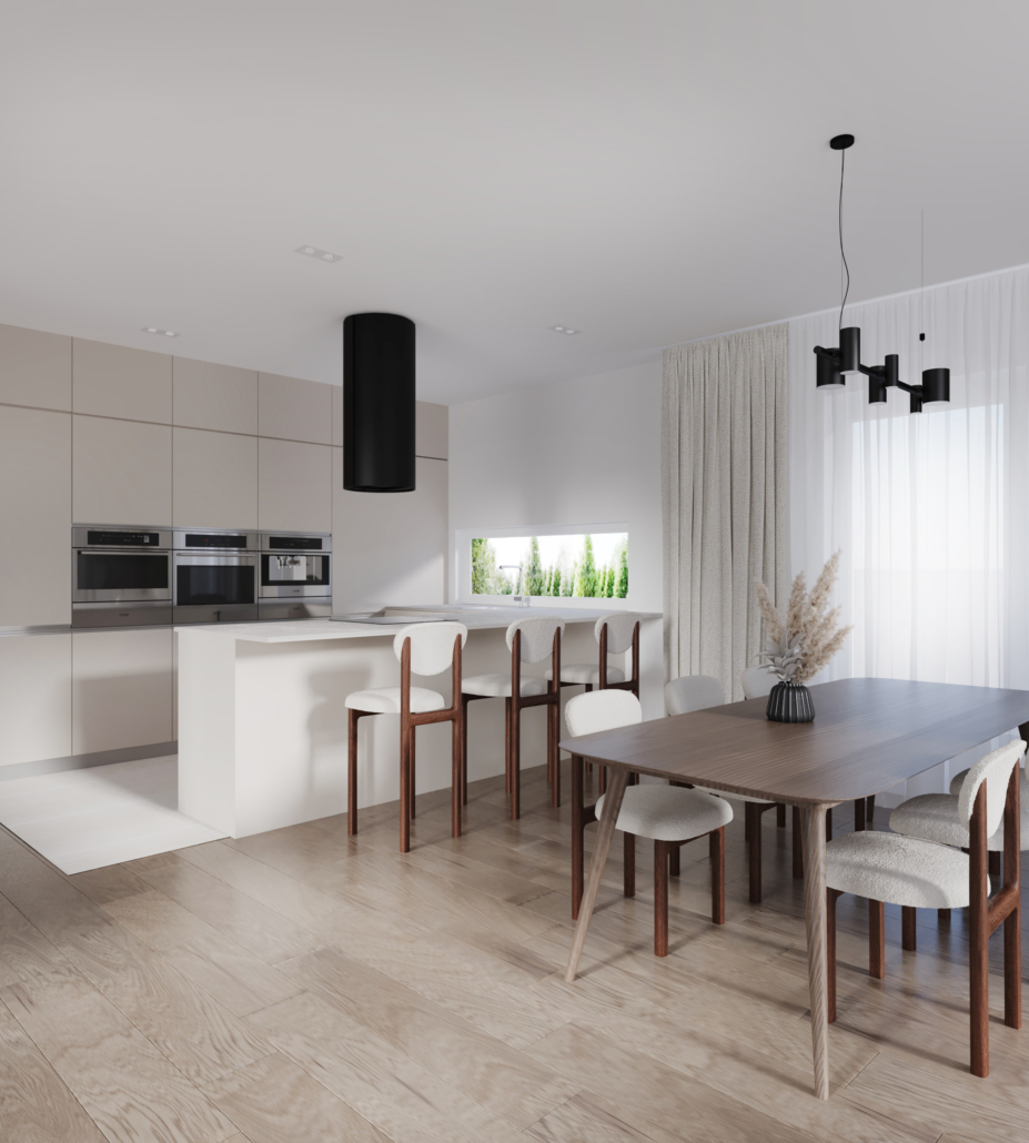 Projekt przewiduje trzy komfortowe pokoje, w tym przytulną sypialnię z własną garderobą – prywatną oazę spokoju, w której każdy dzień zaczyna się i kończy w pełnym komforcie.